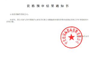 ? 2023年6月19日,山东胜利钢管有限公司收到中化建国际招标责任有限公司书面通知: “山东胜利钢管有限公司:经评审,贵公司参与的中国海洋石油集团有限公司螺旋缝埋弧焊管供应商投标资格公开审查资格预审结果合格?!?/span> 这表明,山东胜利成功入围中国海洋石油集团有限公司的优选供应商,近三年内,公司将具备参与中海油螺旋缝埋弧焊管的投标资格。2023年3月24日,中国海洋石油集团有限公司发出招标公告,就中国海洋石油集团有限公司螺旋缝埋弧焊管供应商投标资格公开审查进行国内公开招标。我公司积极报名参与投标,经过精心准备,于2023年4月7日递交了资格预审文件。本次资格审查采用有限数量制,评审方法使用综合评审法。审查委员会按资格预审文件所附评分标准进行打分,在总得分高于75分的申请人中,按照得分排名由高到低的顺序选择前9家(不足9家时全部选?。?,形成候选申请人名单,进行现场考察。 资格预审文件评审结果我公司排名靠前,顺利进入到现场考察阶段。2023年5月19日,中国海洋石油集团有限公司考察团对我公司进行了现场考察。 现场考察采用否决制,对资格预审申请文件内容的真实性进行逐项审核。考察团重点考察了设备情况、提供证明文件的真实性及大管线生产记录。公司各部门精诚合作,积极配合现场考察工作,现场考察顺利通过,没有任何问题,考察团对我公司高度认可。我公司成功通过中国海洋石油集团有限公司供应商的书面评审及现场考察,为成功进入中国海洋石油集团有限公司的优选供应商奠定了坚实的基础。