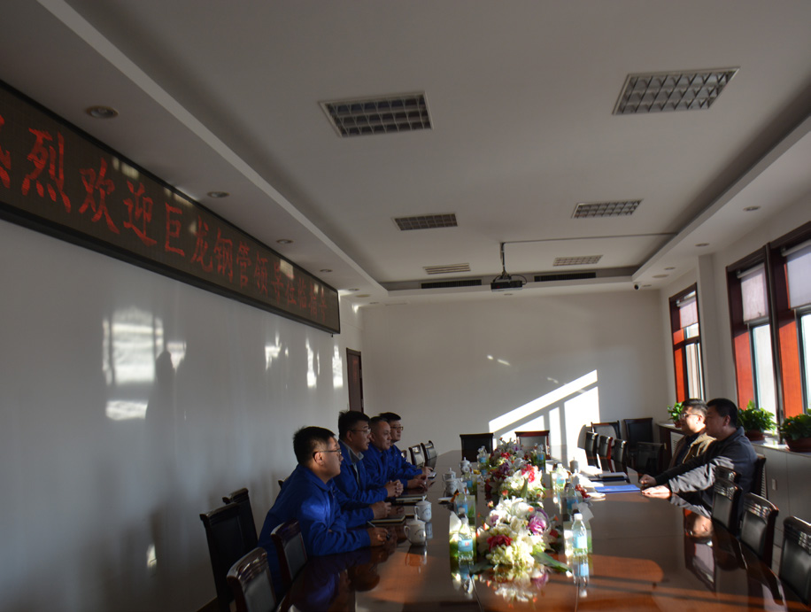 ?12 月 3 日,巨龙钢管有限公司董事长兼总经理吴亚东率领销售管理团队到访山东胜利。公司董事长赵增强、总经理张圣光及相关业务负责人热情迎接了来访贵宾。双方围绕市场趋势、行业发展和多领域战略合作等核心议题,进行了深入而友好的座谈交流,并实地考察了预精焊分厂。